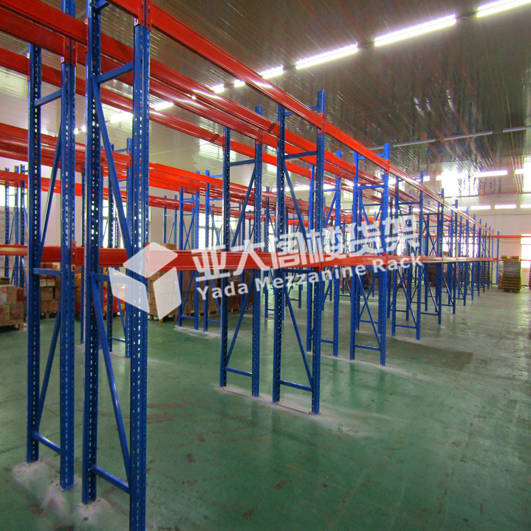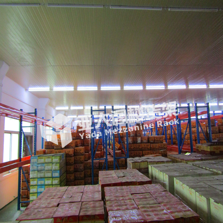 亞大貨架設備有限公司為懂香文化有限公司提供重型貨架100余組,貨架采用2層橫梁設計,每層承重2噸。貨架立柱采用70*90*2.0U型鋼,貨架橫梁使用50*140*1.5抱焊梁,小跨梁材料為40*40*1.5方管。因托盤貨架的特點,根據該司托盤1100*1100的托盤尺寸,我們設計的貨架尺寸為L2500*D1000*H5500,2層橫梁貨架可放置3層貨物,提高倉庫容積率的同時,也減少了使用成本,是重型倉庫貨架使用的典型案例。