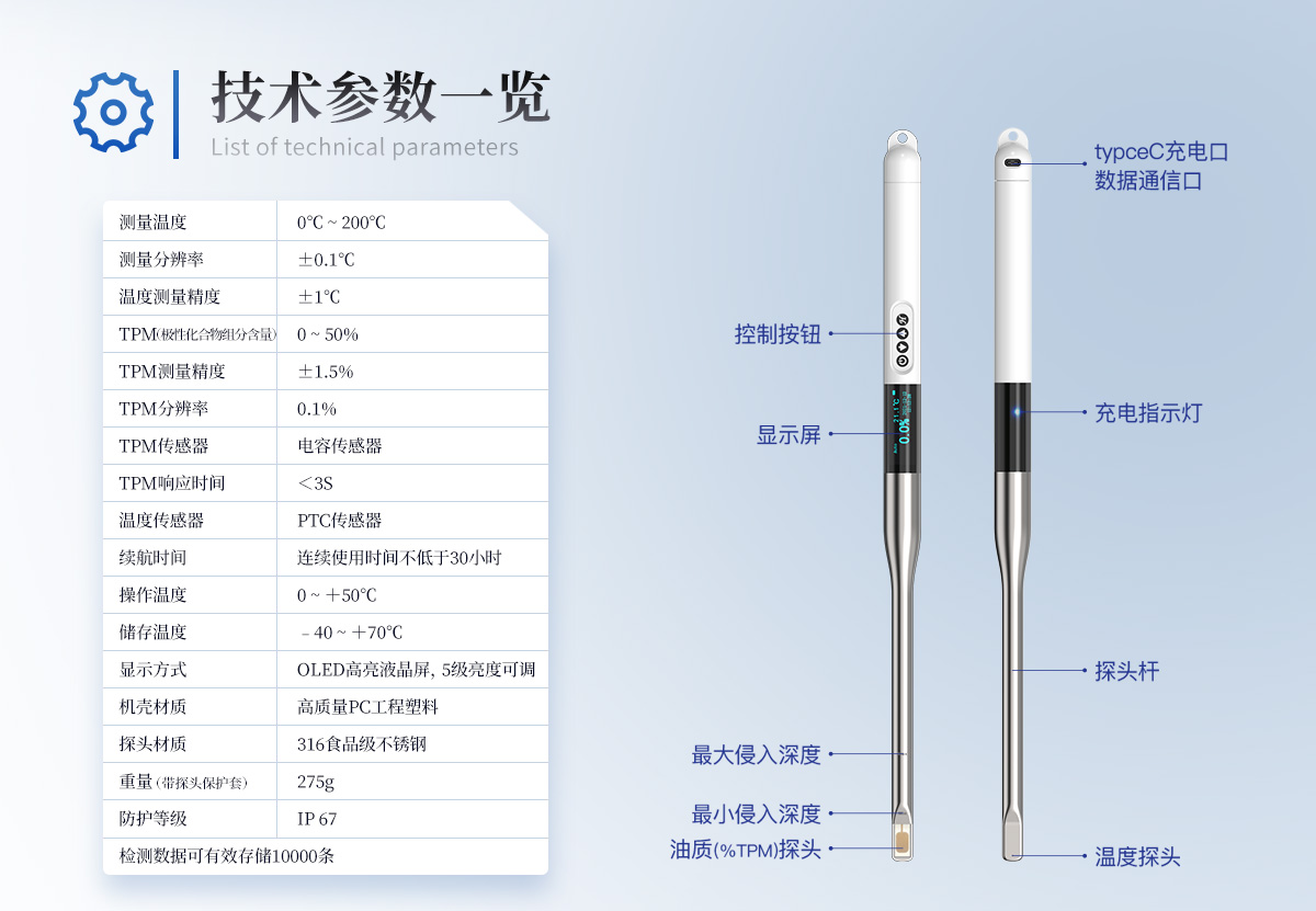 食用油脂是人們攝取能量和營養(yǎng)的重要來源,是加工食品的重要原料。油炸食品以其特有風(fēng)味廣受消費(fèi)者喜歡。用于煎炸的食用油在高溫煎炸過程中發(fā)生一系列的物理、化學(xué)變化,這些變化會(huì)生成對(duì)身體健康有害的物質(zhì)。目前,煎炸食用油的傳統(tǒng)檢測方法多為化學(xué)方法,這些方法必須在實(shí)驗(yàn)室內(nèi)由專業(yè)人員操作,費(fèi)時(shí)費(fèi)力,化學(xué)試劑的使用可能會(huì)傷害檢測人員健康,且化學(xué)廢劑污染了環(huán)境。YT-SYP是一種快速,安全,**食用油品質(zhì)檢測儀,能夠快速檢測食用油中的極性化合物組分含量。本產(chǎn)品能夠在油溫較高的環(huán)境下使用,適用于各種煎炸的食用油品質(zhì)檢驗(yàn)。